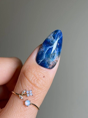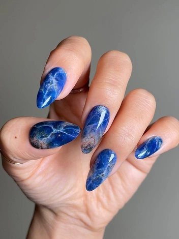 Синяя цветовая гамма на пике популярности уже не первый сезон, и он не выйдет «в тираж» никогда. Невероятное очарование глубоких тонов с серебристым переплетением нежно-дымчатых оттенков, в созвездии с мерцанием звездной пыли — это просто космос, от которого не оторвать взгляд. А сочетание синевы с белой палитрой прожилок, как в благородном камне — однозначно беспроигрышный вариант на эту зиму.