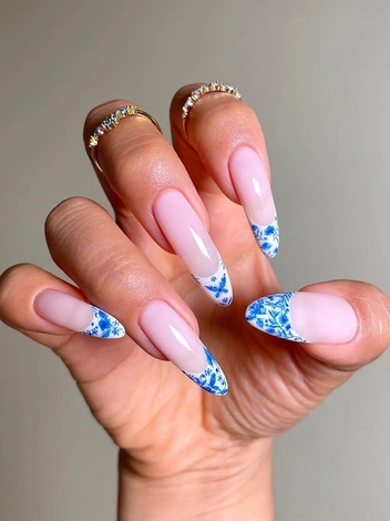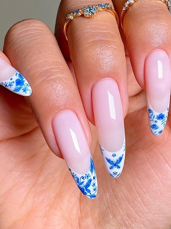Мотивы из русских народных сказок и преданий можно легко воплотить на своих ногтях. Вам лишь остается покрыть ногти белым лаком (не важно, матовым или глянцевым), а затем с помощью каплевидных мазков синего цвета нарисовать узоры.