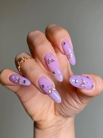 Мелкие светоотражающие частицы создают соблазнительный блеск на ногтях с глянцевым финишем. Оттенок можно выбрать любой, но самым выигрышным вариантом для новогодней ночи станет небесно-голубой с эффектом заледенения, серебристый и нежно-розовый.