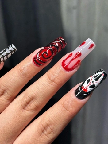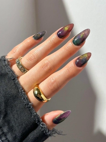 Эффект змеиных чешуек — это тренд, который легко адаптировать для Хэллоуина, используя темные, блестящие оттенки, такие как глубокий зеленый, черный и золотой. Для создания эффекта можно использовать специальные наклейки или текстурированные лаки, которые придают ногтям объем. Этот дизайн маникюра идеально подойдет для тех, кто хочет добавить своему образу загадочности и чувственности.