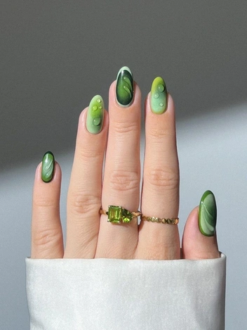 Для более драматичного эффекта можно использовать черный фон, на котором туман будет казаться более густым и таинственным. Маленькие детали, такие как ветви деревьев, силуэты птиц или летучих мышей, добавят глубину и загадочность вашему маникюру. Полупрозрачные слои можно чередовать с матовым покрытием, что создаст дополнительный объем и игру текстур. Такой дизайн подойдет как для повседневного ношения, так и для праздника, особенно если это часть вашего образа.