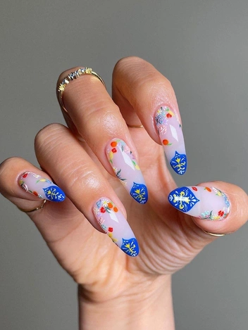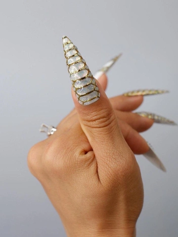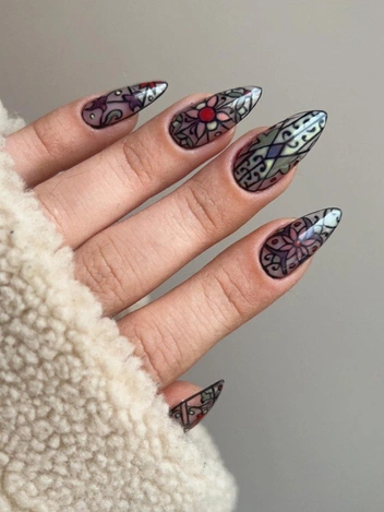 Эффекта стеклянных узоров витражей можно добиться с помощью черных, красных, зеленых, синих и золотых тонов, которые создают глубокую контрастность. Черный цвет может служить основой, а золотые и красные линии — элементами узоров, создающими игру света и тени. Для идеальной проработки рисунка потребуется тонкая золотая или серебряная проволока, которая придаст ногтям утонченный и роскошный вид. Такой маникюр требует аккуратности и внимания к деталям, но результат стоит затраченных усилий. Этот дизайн подойдет не только для Хэллоуина, но и для любого случая, когда требуется сочетание элегантности и мистики.