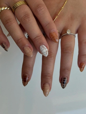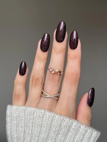 Прозрачный черный лак с текстурированными элементами может стать центральным элементом хэллоуиновского маникюра, создавая эффект старого, разбитого стекла. Для создания такого образа важно использовать полупрозрачный черный лак, чтобы сквозь него просвечивали нижние слои, придавая дизайну глубину. Можно добавить осколки из фольги, имитирующие трещины, или блестки, которые будут отражать свет, усиливая ощущение мистики и загадочности (читайте также: Тренды корейского маникюра 2024/25: полный гид).