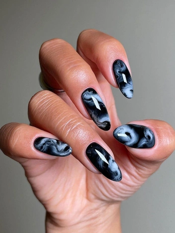 Еще одно интересное решение для маникюра на Хэллоуин — это создание эффекта тумана на ногтях. Этот дизайн подойдет для тех, кто предпочитает более сдержанные, но все же мистические образы. Для достижения эффекта тумана используются полупрозрачные оттенки серого и белого, которые создают иллюзию мягкой дымки.