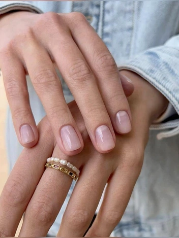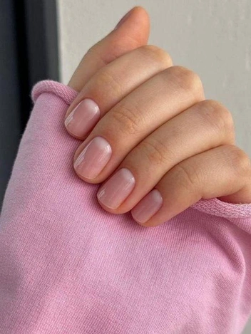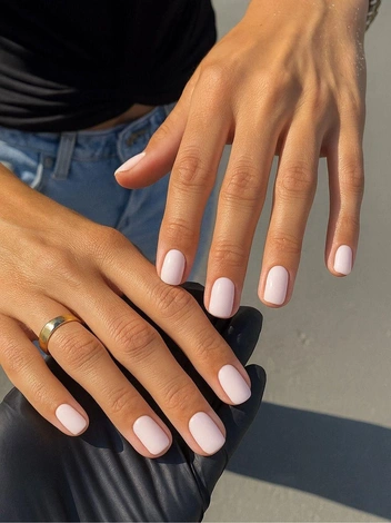 Нежно розовый оттенок на коротких ногтях создает ощущение чистоты и аккуратности. Он незаметно укрепляет образ: смягчает жесткие линии, придает рукам ухоженный вид и оставляет пространство для естественности.