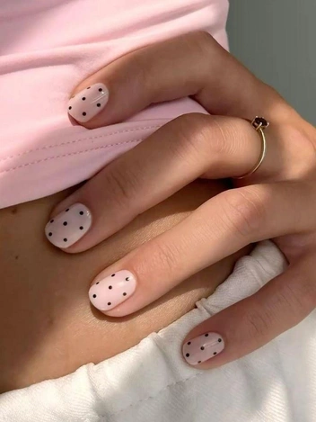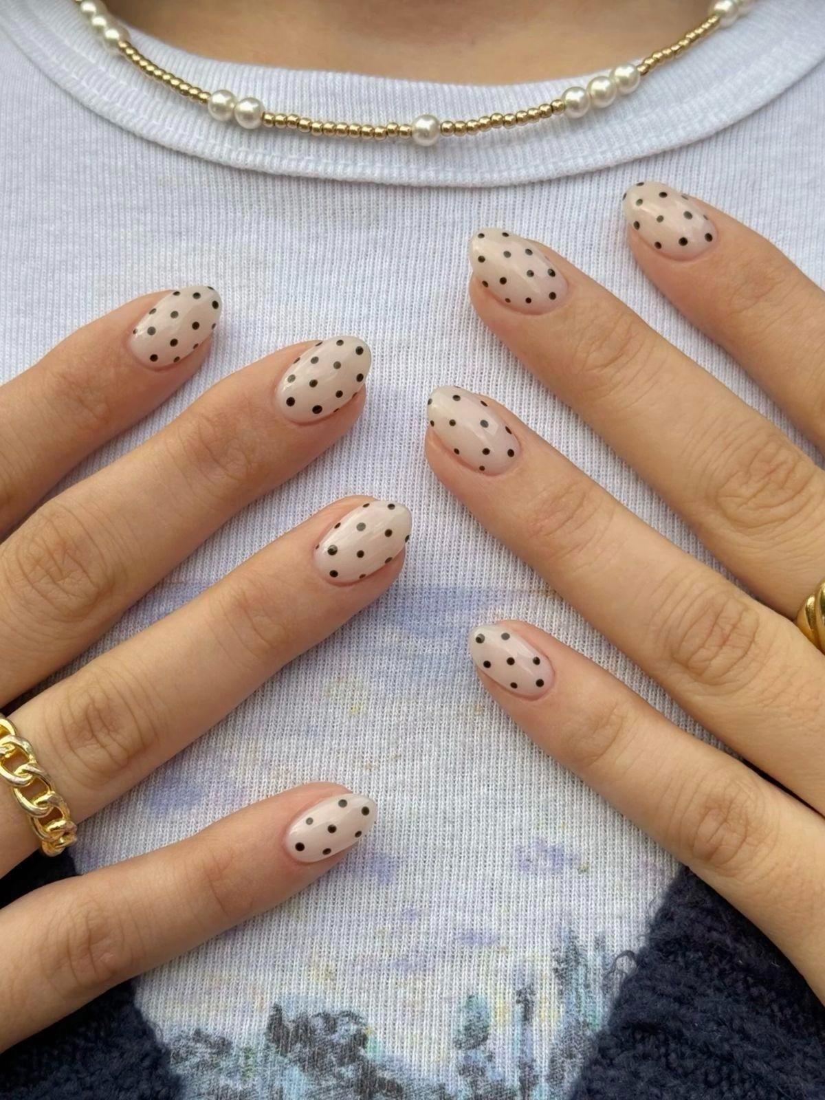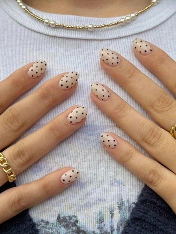 Обычно выбирают контрастные сочетания: светлая основа с темными точками или темная основа со светлыми. На коротких ногтях это смотрится особенно чисто, потому что элемент остается небольшим и не меняет форму ногтя.