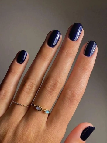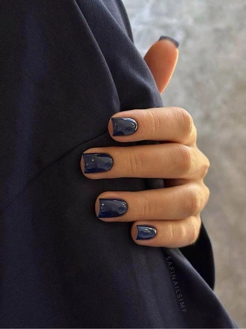 Темно-синий оттенок задает жесткий ритм и делает маникюр более структурным. На коротких ногтях он смотрится особенно уверенно: площадь небольшая, цвет ложится плотным слоем, создавая чистую поверхность.