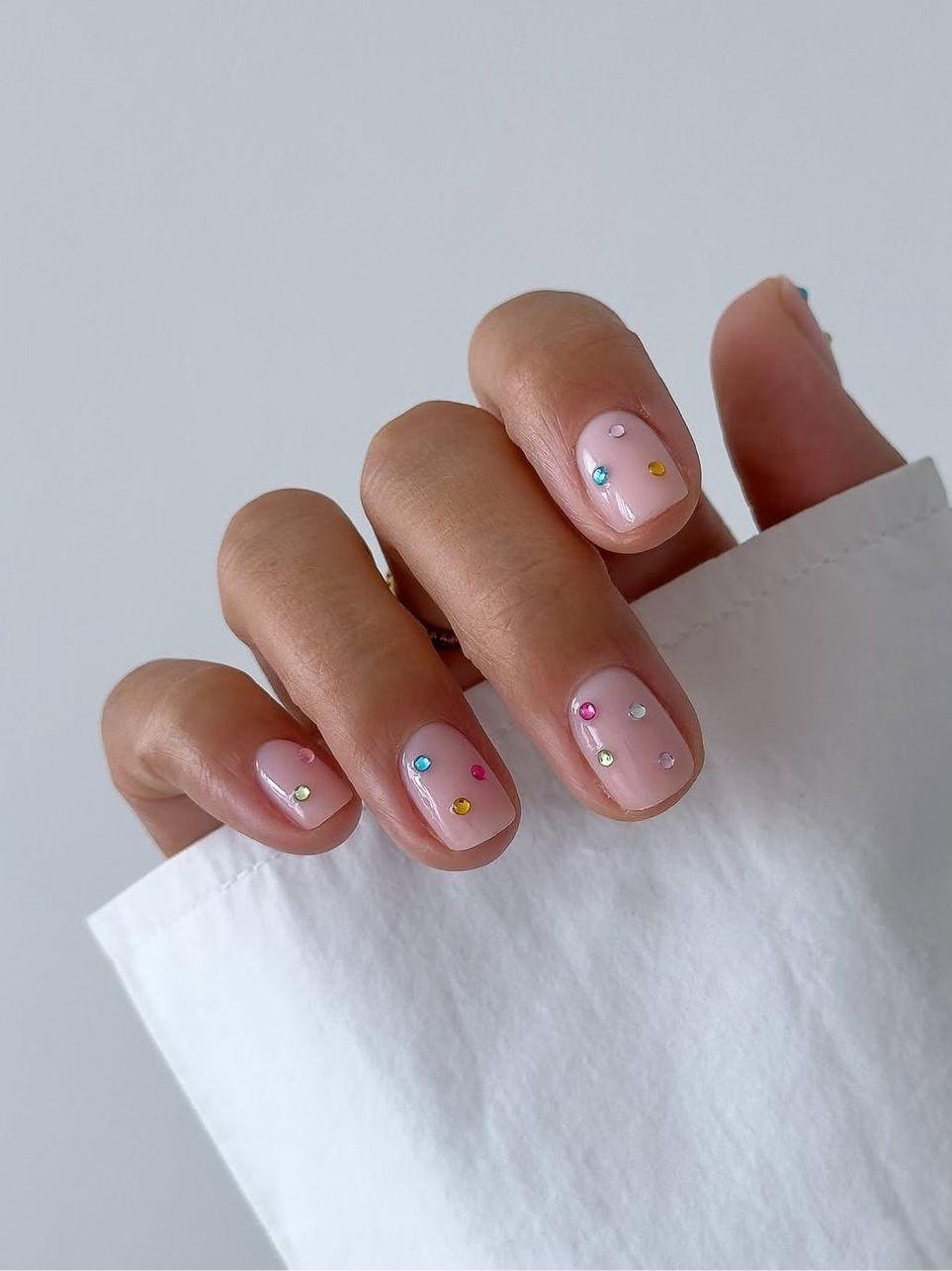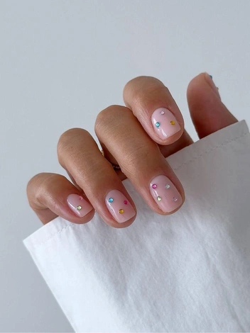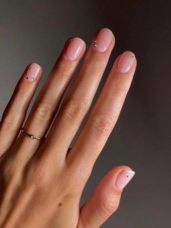 Можно расположить стразы по одному на каждом ногте или выбрать пару акцентных пальцев. Цвет основы тоже влияет на впечатление. Стразы лучше смотрятся на спокойных оттенках — молочном, серо-бежевом, мягком розовом. Такой маникюр подходит тем, кто хочет добавить в свой образ небольшой световой акцент, не делая его слишком ярким. Он уместен в деловом ритме, на вечерних мероприятиях и в повседневной жизни. Короткая длина делает сияние более точным и аккуратным.