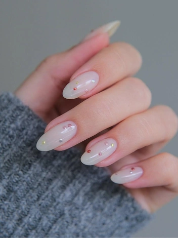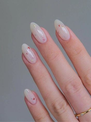 Добавить «конфетти» на свои ногти — интересный способ разнообразить классическое молочное покрытие. Выбор декора для такого маникюра огромен: от мелких блесток до крупных шестиугольников, от однотонных до радужных переливов. «Конфетти» можно нанести на все ногти или выделить один-два пальца для более сдержанного, но не менее эффектного акцента. Их также можно выложить в определенный узор, хаотично рассыпать по поверхности или создать эффект омбре. Важно закрепить декор несколькими слоями топового покрытия, чтобы маникюр продержался как можно дольше и элементы не отслоились. Этот вариант маникюра на миндальные ногти в 2025 году предлагают многие топовые мастера нейл-арта: по-весеннему нежно и визуально удлиняет кисти рук.