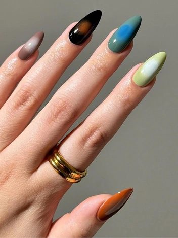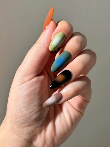 Маникюр «аура» на миндальные ногти 2025 — усовершенствованная версия популярного корейского маникюра с румянцем. Аура — невидимая сфера, окружающая человека и отражающая его энергию. Поэтому сам дизайн подразумевает создание эффекта сияющих кругов на ногтях. И в отличие от линейного градиента, здесь мастер создает радиальный переход цвета, то есть лучи исходят из центра ногтевой пластины. Этот эффект достигается благодаря плавному переходу от насыщенного центрального цвета к более мягкому, размытому оттенку по краям. Именно эта особенность и создает иллюзию глубины и объема на ногтях.