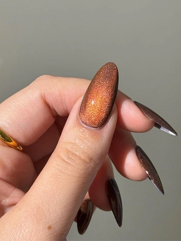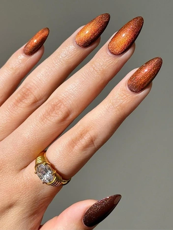 Оттенок интересен тем, что он сочетает в себе оранжево-коричнево-красную палитру, при этом не утяжеляя ногти своей глубиной. Цвет не выглядит мрачным или скучным, наоборот, такой вариант станет достойной заменой шоколадному однотонному покрытию. Чтобы дизайн смотрелся еще интереснее, добавьте на ногти больше мерцания с помощью втирки или перламутрового лака. Такой вариант маникюра на миндальные ногти в 2025 году будет выглядеть свежо и необычно.
