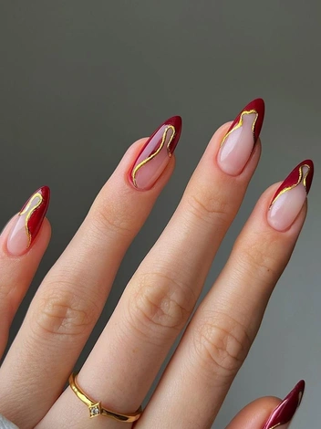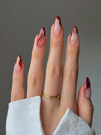 Винный маникюр — неустаревающая классика в мире нейл-дизайнов, однако с наступлением весны всегда хочется чего-то нового и свежего. Поэтому предлагаем вам попробовать сделать не просто однотонное покрытие, а креативный французский маникюр. Для этого откажитесь от классической тонкой полосы по краю ноготков и сделайте хаотичные «волны», обрамляющие ногтевую пластину. Чтобы дизайн выглядел еще эффектнее, добавьте золотые акценты.