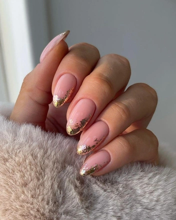 Глиттер можно заменить золотым лаком с эффектом металлик, который выглядит не менее роскошно и празднично. Поверх нюдового покрытия можно сделать золотистую растяжку блесток или объемный дизайн, напоминающий стекающее золото. Нейл-арт можно комбинировать с небольшими рисунками атрибутов Нового года.