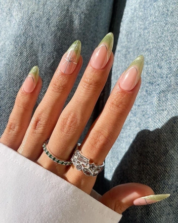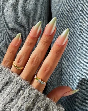 Вместо ярко-зеленого лака мы предлагаем присмотреться к салатовому, который неожиданно стал популярным накануне Нового года. Оттенок матчи выглядит свежо и необычно, а сочетать его можно с блестками или жемчужной втиркой. Один из вариантов — салатовое омбре с легким, полуматовым сиянием, которое можно создать с помощью втирки.