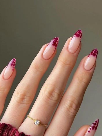 Здесь полет фантазии ничем не ограничен. Можно сделать глянцевое покрытие с рубиновыми стразами по всей пластине, а можно оформить только ногтевой край, добавив шиммера. Не бойтесь экспериментировать — в любом случае дизайн будет выглядеть ярко и торжественно (читайте также: Пилочный маникюр: новый тренд для тех, кто не любит посещать нейл-мастера).