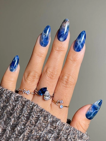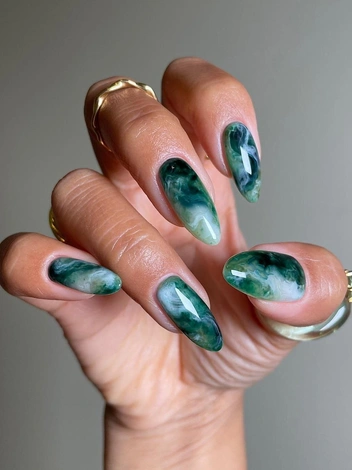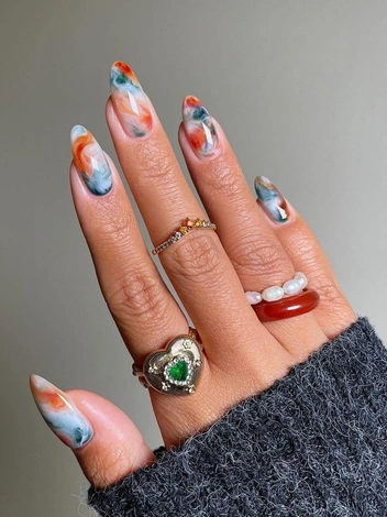 Классная альтернатива акварельному маникюру — мраморный дизайн. Как несложно догадаться из названия, нейл-арт имитирует узоры одного из самых редких и ценных камней — мрамора. Для создания большей натуральности можно добавлять мелкие цветные вкрапления, которые можно встретить в составе горных пород. Результат необходимо закрепить глянцевым топом для сияющего финиша.
