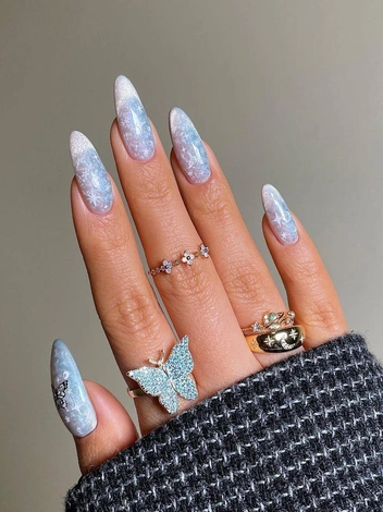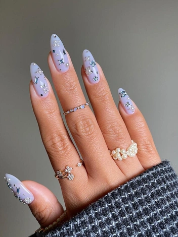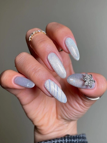Завораживающий дизайн ногтей, который не оставит вас незамеченной на любом корпоративе или вечеринке, — маникюр «ледяной перламутр». Обилие перламутровых частичек, красиво переливающихся на свету, создают эффект заснеженности, словно на ногти приземлились миллионы крохотных снежинок. Нейл-арт можно дополнить декоративными элементами или наклейками — так дизайн станет еще интереснее.