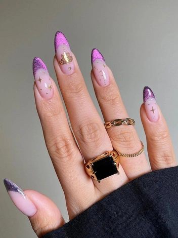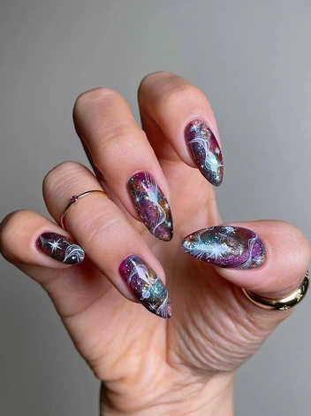 Если получить расположение главного символа года вам не так важно, то попробуйте поймать удачу за хвост с помощью космического дизайна. Выглядит такой нейл-арт очень захватывающе: фиолетовые переливы плавно «растекаются» под слоем перламутровых блесток. Для большего эффекта попробуйте нарисовать планеты или созвездия.