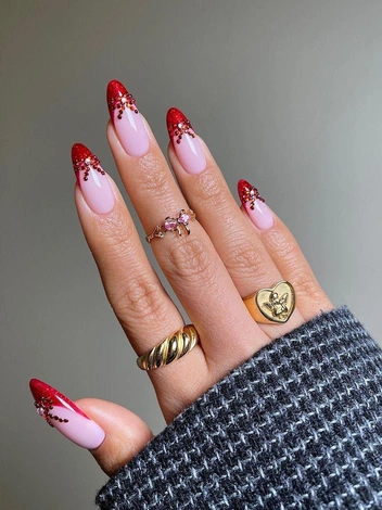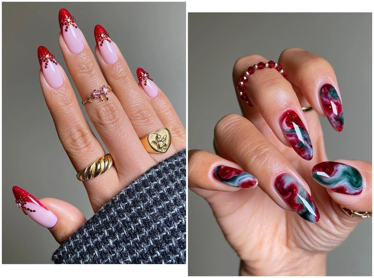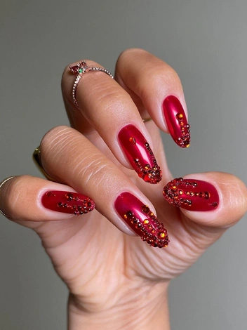 Здесь полет фантазии ничем не ограничен. Можно сделать глянцевое покрытие с рубиновыми стразами по всей пластине, а можно оформить только ногтевой край, добавив шиммера. Не бойтесь экспериментировать — в любом случае дизайн будет выглядеть ярко и торжественно (читайте также: Пилочный маникюр: новый тренд для тех, кто не любит посещать нейл-мастера).