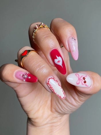 Сделать романтичный дизайн можно, не дожидаясь 14 февраля. Главная особенность такого нейл-арта — сочетание красного, розового и белого оттенков, идеально гармонирующих между собой. Чтобы маникюр выглядел более интересно, попробуйте добавить жемчужины, стразы, шиммер или тонкой кистью нарисовать минималистичные узоры.