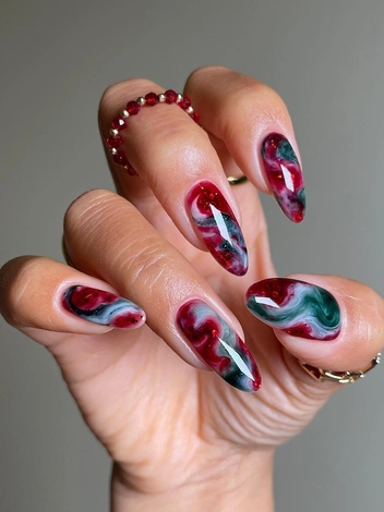 Еще один завораживающий дизайн, который идеально впишется в новогодние и рождественские образы, — акварельный маникюр. За счет цветных переливов, плавно растянутых по всей площади ногтевой пластины, получается создать эффект разлитой акварельной краски, запечатанной под стеклом. Советуем использовать не более двух оттенков, добавляя их на молочную основу.