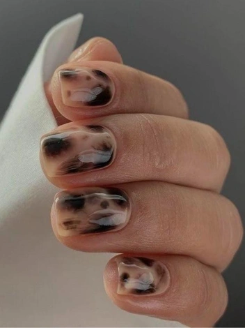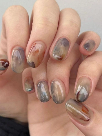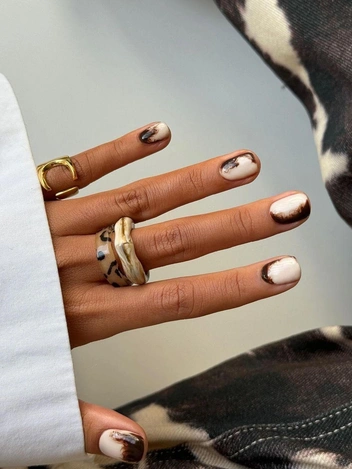 Современная версия мраморного дизайна. Маникюр на 2026 год с кофейными разводами создается с помощью полупрозрачных бежевых и коричневых оттенков, плавно перетекающих друг в друга. Каждый ноготь имеет уникальный рисунок. В праздничных вариантах добавляют золотые контуры или втирку для легкого блеска. Такой маникюр на Новый год 2026 выглядит дорого и естественно, хорошо сочетается с теплой одеждой и спокойным макияжем.