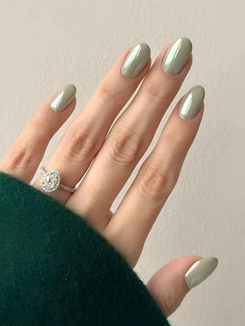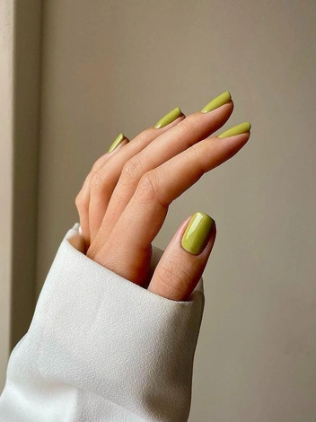 Теплый зеленый с легким золотистым подтоном — оттенок, который будто переносит солнечное тепло на кончики пальцев. В маникюре на Новый год 2026 он выглядит мягко, но не тускло: светлый, утонченный, с деликатным свечением, напоминающим утренний свет. Этот цвет особенно хорошо раскрывается в глянцевой текстуре и на овальных ногтях средней длины.