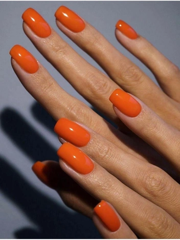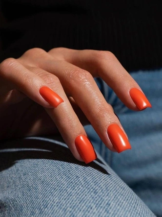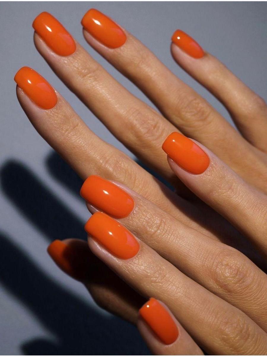 Маникюр на Новый год 2026 в огненно-оранжевом оттеноке передает энергичность и готовность к действию. Он особенно выразителен на овальных ногтях средней длины. В матовом варианте выглядит технологично, в глянцевом — современно и динамично. Этот цвет маникюра на 2026 добавляет тепла зимнему образу и гармонирует с золотыми украшениями.