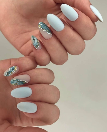 Нежный, полупрозрачный цвет морской волны прекрасен и вполне самодостаточен на ногтях. Вы можете попросить мастера составить колоритный микс из разных морских оттенков и составить свой неповторимый нейл-дизайн в круизном стиле.