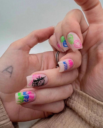 Броским стилем современного искусства является поп-арт. Его часто выбирают для создания дизайна маникюра. Направление красочное, запоминающееся, полное внезапных экспериментов. Самыми трендовыми мотивами поп-арта стали абстракции и логотипы брендов, портреты и рисунки губ, стилизация под детские рисунки (читайте также: «Главные тренды маникюра весны и лета 2022»).