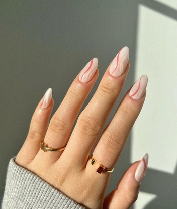 Не забываем про свирлы — абстрактные линии, украшающие ноготь. Если вам хочется привнести в жизнь немного праздника, попробуйте сделать красно-белые свирлы, напоминающие рождественские леденцы. Вообще красно-белое сочетание всегда смотрится выигрышно в новогоднем маникюре, но можно и не бояться экспериментов и, например, сочетать красный и зеленый оттенки лаков, или зеленый с белым.