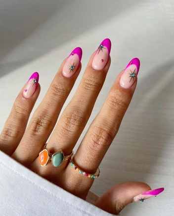 Такой дизайн сложно выполнить самостоятельно, но его вам точно смогут выполнить в профессиональном салоне. При помощи трафаретов, мастер может нанести звезды различных размеров на ногти, предварительно покрытые оттенком, который подчеркнет дизайн. Например, хорошо и выгодно будут смотреться звезды из серебряного глиттера на черном оттенке или на белом оттенке. В общем развернуться есть где!