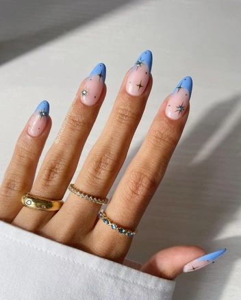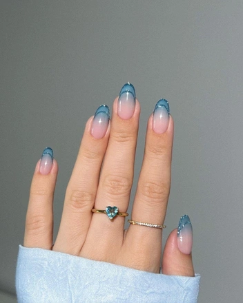 Невероятно нежный и интересный дизайн — пастельно-голубой френч. Если у вас есть желание добавить немного яркости. То можете выложить при помощи глиттера снежинку на ногтях, или же выполнить френч на безымянном пальце при помощи серебристых блесток (читайте также: Маникюр для овальных ногтей: 7 модных идей для любителей необычного дизайна).