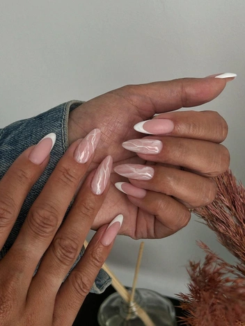 Изысканный мраморный маникюр создает ощущение элегантности и роскоши. Этот дизайн часто включает мягкие оттенки белого и розового с добавлением тонких золотых или серебряных линий для изящного блеска, идеально подходящего под свадебное платье.