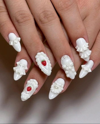 В основу дизайна лег стиль торта, который кондитеры называют «Ламбет» — это винтажная техника украшения десерта, при которой на него помещают «драпировки» и резные детали из крема. Чтобы воссоздать такой же эффект на ногтях используются готовые 3D-фигурки в виде сливочных пиков, ягод и конфет, а также плотный акригель, из которого кисточкой создают те самые завитки (читайте также: Маникюр на короткие ногти в 2025 году: чересчур кокетливо и сливочно-нежно).