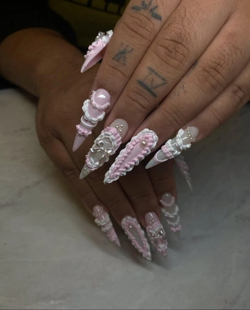 Поклонникам быстрого маникюра стоит отойти от экранов, ведь ради этого тренда стоит быть готовым просидеть в кресле у мастера не один час. По сути, cake nails — это имитация настоящей сладости с рисунками из глазури, сахарной посыпкой и объемными узорами из взбитых сливок. Правда, вместо кондитерских инструментов для его создания пригодятся вполне обычные маникюрные, а вместо крема — специальный гель.