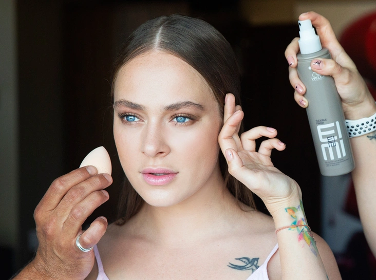 Команда Max Factor выбрала для Аглаи свежий и выразительный вариант макияжа. В качестве тонального средства была выбрана основа Healthy Skin Harmony. Главная особенность ─ она очень тонко наносится и полностью сливается с оттенком кожи. Румянами Crème Puff визажисты совсем немного освежили лицо, а в область над румянами нанесли немного хайлайтера из палетки Miracle Glow Duo, выполнив более темным оттенком коррекцию овала лица. Розово-бежевыми тенями из палетки Masterpiece Nude Palette был выполнен нюдовый макияж глаз ─ свежий и абсолютно летний. Ацент был сделан на бровях ─ их расчесали и уложили прозрачным гелем Natural Brow Styler, заполнив форму карандашом Brow Shaper. Ресницы визажисты прокрасили в несколько слоев тушью Dark Magic, а на губы нанесли блеск Colour Elixir нежного розового оттенка.