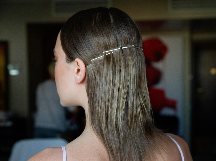 - Плотно прочесываем волосы частой расческой, нанося при этом неаэрозольный моделирующий спрей для подвижной фиксации, туго закрепляем невидимками за ушами. В завершение продолжаем линию невидимок по всему затылку и фиксируем укладку с помощью сухого лака.