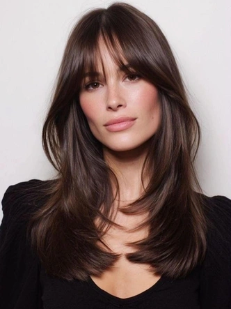 Прямая челка — классическая форма, которая не выходит из моды. В версии стрижек на 2026 год она становится мягче: плотность сохраняется, но без тяжести. Линия среза проходит чуть выше бровей, что делает взгляд открытым и придает лицу четкие пропорции. Такая стрижка с челкой 2026 подходит для ровных волос, где особенно важна аккуратность линии, и гармонично сочетается с каре, лобом или каскадом.
