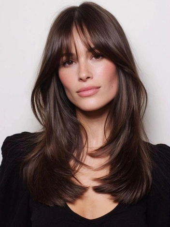 Удлиненная стрижка с челкой 2026 выглядит особенно выразительно в движении: пряди мягко расходятся по сторонам, открывая лоб, или, наоборот, могут соединяться в центре, создавая легкую завесу. Для тех, кто не хочет радикальных изменений, но стремится добавить образу индивидуальности, эта форма становится самым оптимальным решением. Она не перегружает черты лица, но придает выразительность взгляду и делает утонченее овал.