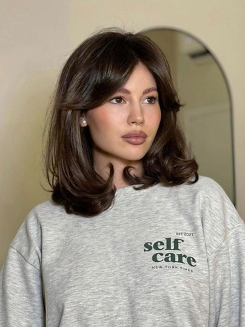 Эта стрижка на средние волосы 2026 универсальна — она не требует постоянного обновления и держит структуру даже при отрастании. Для тех, кто не любит частые походы в салон, это особенно удобно. Лоб можно дополнять удлиненной челкой, боковым пробором или легким градуированием у лица — каждый элемент придает индивидуальность, не разрушая основную линию.