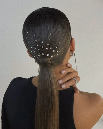 Хвост — одна из самых удобных укладок, сделать которую более праздничной помогут украшения, стразы и глиттер. Они могут быть дополнением образа или даже продолжением вашего макияжа, сделав его еще более эффектным. Сначала сделайте низкий гладкий хвост с помощью геля или воска для укладки. Затем прикрепите украшения у основания хвоста или же по бокам. Еще один вариант — украсить объемными стразами пробор.