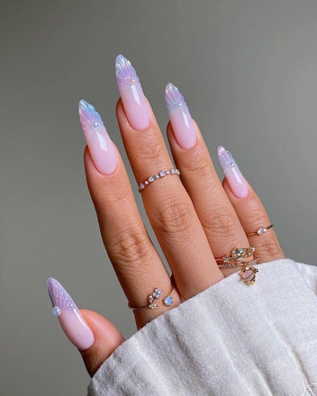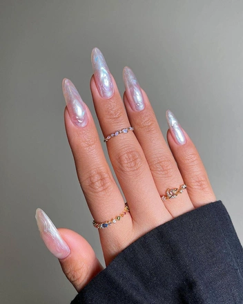 Mermaidcore не покинет нас еще долгое время, и в этом сезоне «маникюр русалки» — один из самых красивых трендов для невест. Дизайн понравится поклонницам объемного и креативного нейл-арта: на ногтях можно создать очертания ракушек, украсить их жемчугом или покрыть перламутровыми лаками (читайте также: Самый модный маникюр 2024: 7 идей для коротких и длинных ногтей).