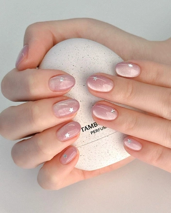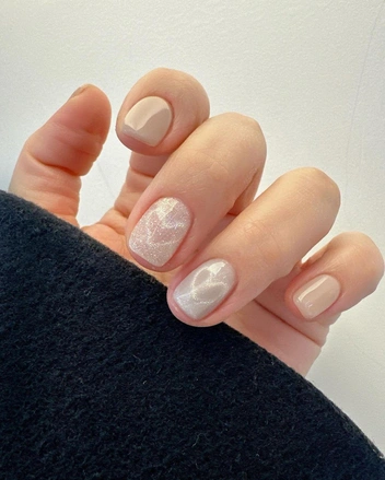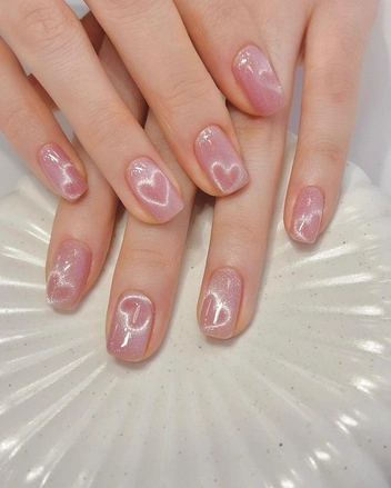 Вместо обычных рисунков мы предлагаем сделать сердца поверх дизайна «кошачий глаз». Необычный нейл-арт стал популярным в начале 2024 года и уже успел завоевать популярность среди нейл-инфюенсеров. Повторить маникюр поможет раздвоенный магнит — уточните перед записью, сможет ли ваш мастер его повторить.