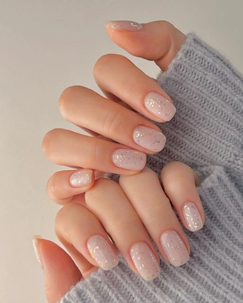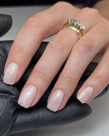 Еще одно популярное комбо для свадьбы — молочная база и топ с мелкими блестками. Такой маникюр выглядит нежно и празднично, будет красиво переливаться под лучами солнца или софитами. Еще одно преимущество маникюра — он подойдет как длинным, так и коротким ногтям.
