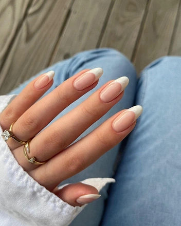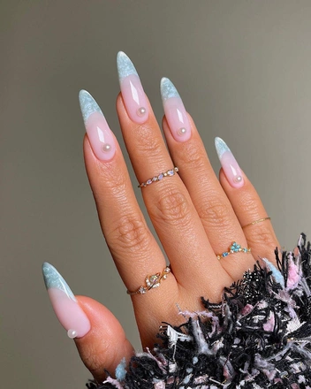 Еще один способ разнообразить классический французский маникюр — добавить к покрытию жемчужную втирку. Благодаря ей ногти будут красиво переливаться под лучами солнца. Попросите мастера сначала сделать обычный френч в белых оттенках, а затем нанести втирку с розовыми или голубыми переливами.