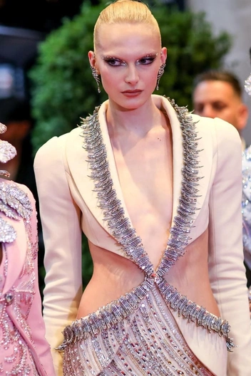 Алекс Консани, судя по всему, проигнорировала тему бала, но это не помешало ей во всех смыслах блистать на дорожке. Наряд модели разрабатывала команда Swarovski, поэтому платье было полностью расшито фирменными кристаллами бренда — их оказалось около 18,5 тысяч. Продолжить сверкающий эффект было решено и в макияже, а потому, визажисты осветлили брови Алекс, а весь акцент перенесли на глаза: поверх коричневого смоки-айс они добавили еще и линию из страз.