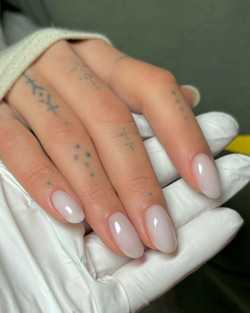 После подготовки ногтевой пластины и выполненного маникюра нужно смешать сразу два геля: полностью прозрачный и каплю белого. Насыщенность можно регулировать, добавляя чуть больше одного или второго. К слову, на рынке представлены и готовые материалы в этом оттенке. Причем не только специального покрытия для UV-лампы, но и самых обычных лаков для ногтей. Так что даже сторонницы традиционного маникюра могут побаловать себя этим интересным вариантом.