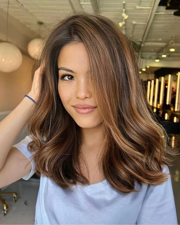Обладательницам темных волос советуем обратить внимаете на оттенок шоколадный мокко. Шоколадный мокко — один из красивых природных оттенков, который точно будет популярен в 2023 году. С ним волосы блестят благодаря приглушенными золотистыми переливами. Также можно подчеркнуть текстуру волос, добавив темно-коричневые блики.