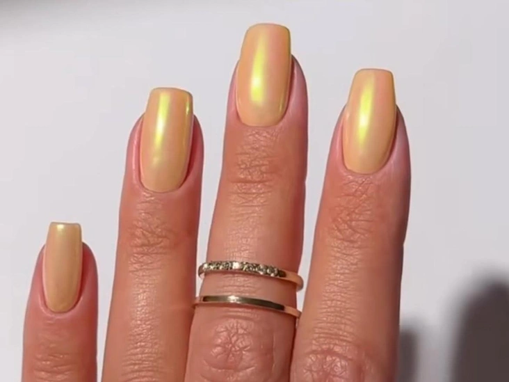 Но, пожалуй, самый эффектный способ носить этот цвет — в технике chrome yellow butter nails. Это вариант маникюра, в котором поверх желтого оттенка наносится полупрозрачная втирка, создавая легкое сияние, отсылающее к уже знаменитым «глазированным» ногтям. Такой эффект делает ногти более акцентными за счет дополнительного мерцания и выигрышно смотрится в лучах яркого весеннего солнца (читайте также: Нуар в стиле Fendi и конфетный от Gucci: главные тренды маникюра с модных показов).